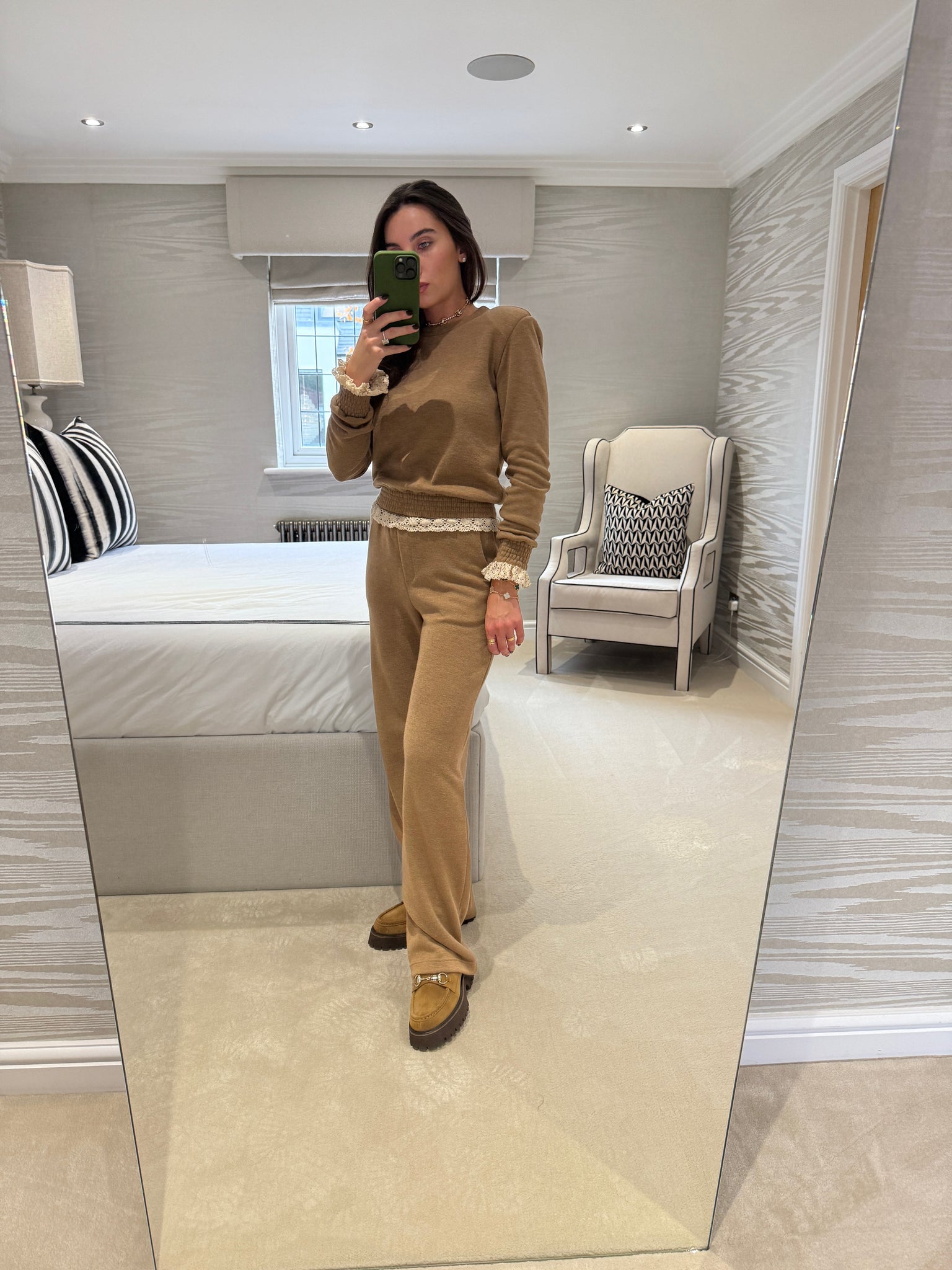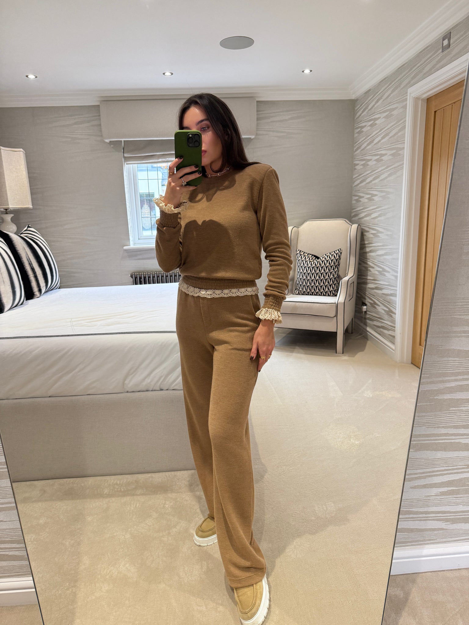 - Fit runs true to size however this is an oversized fit on the trousers, model wears size 6 32" leg (If you are inbetween sizing we recommend sizing down)