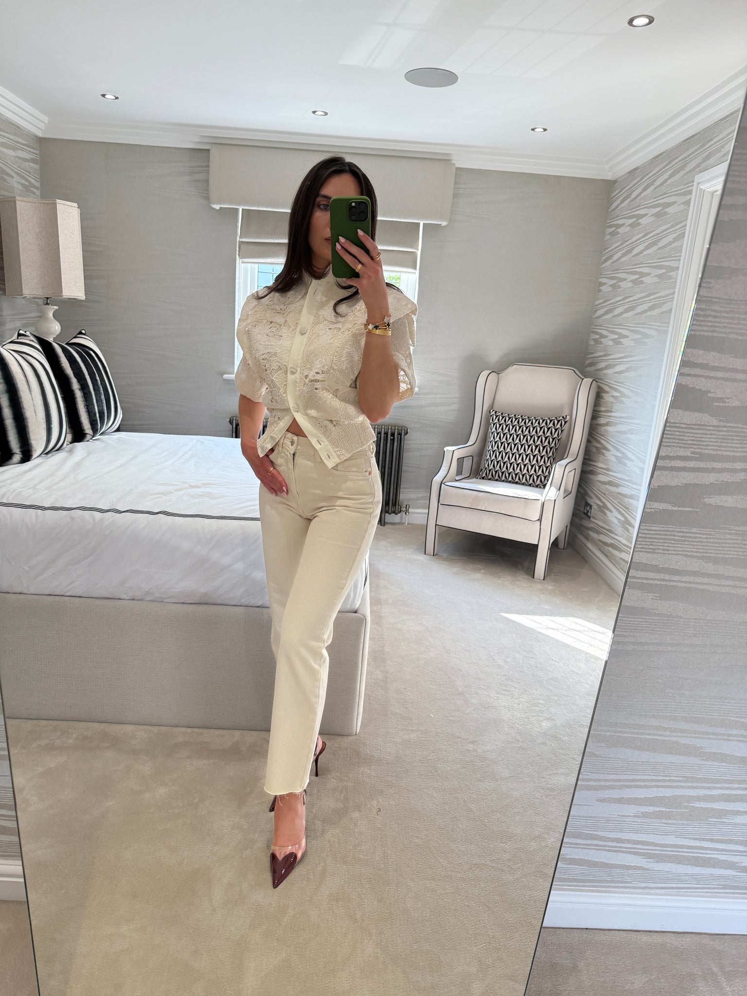 • Stunning Structured Short Sleeve Jacket With Box shoulder detail, pockets, shirred waistband.